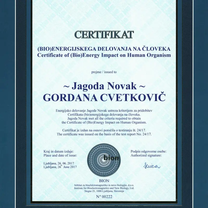 Za vašo popolno transparentnost in zaupanje sem na voljo z vsemi potrebnimi certifikati in poročili o testiranju ( inštitut Bion), ki potrjujejo kakovost mojih storitev. Prepričajte se o mojih usposobljenostih in strokovnem pristopu.
